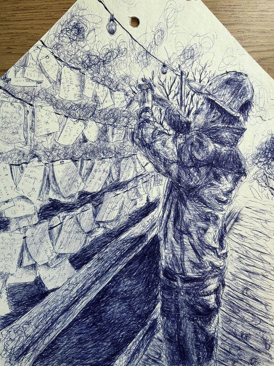 This piece is a pen drawing on a piece of paper. The paper is shaped to mimic the hanging cards in a photo. I took the photo myself when I was on vacation in LA and we visited a canal. On one of the bridges was lines of cards with people's dreams written on them. I wrote one and my brother hung it up for me - hence, the photo is of my brother tying the card onto the bridge.